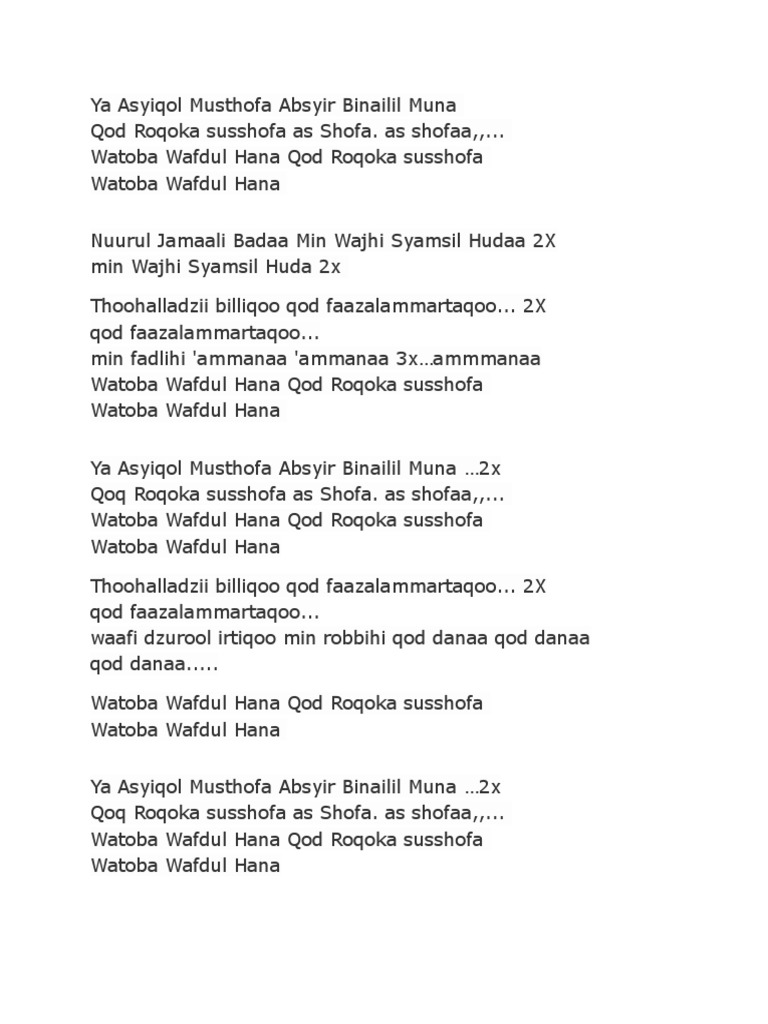 . Lirik ya asyiqol musthofa arab dan terjemah. Qod Roqoka susshofa Watoba Wafdul Hana. Semoga bermanfaat dan kecintaan kita kepada Rasululullah Muhammad Saw semakin meningkat dengan cara memperbanyak membaca Shalawat atas beliau.